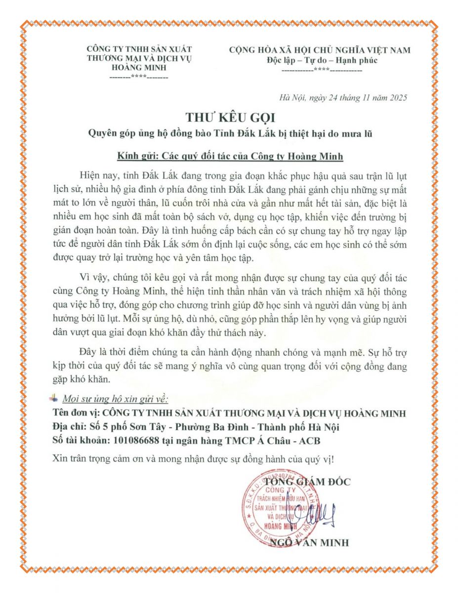 Thư kêu gọi chung tay khắc phục hậu quả giúp người dân vùng lũ tại Tỉnh Đắk Lắk